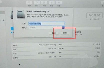 3、点击选择了左侧第一个磁盘以后,接着点击抹掉这个选项按钮,弹出窗口后需要再次点击抹掉。